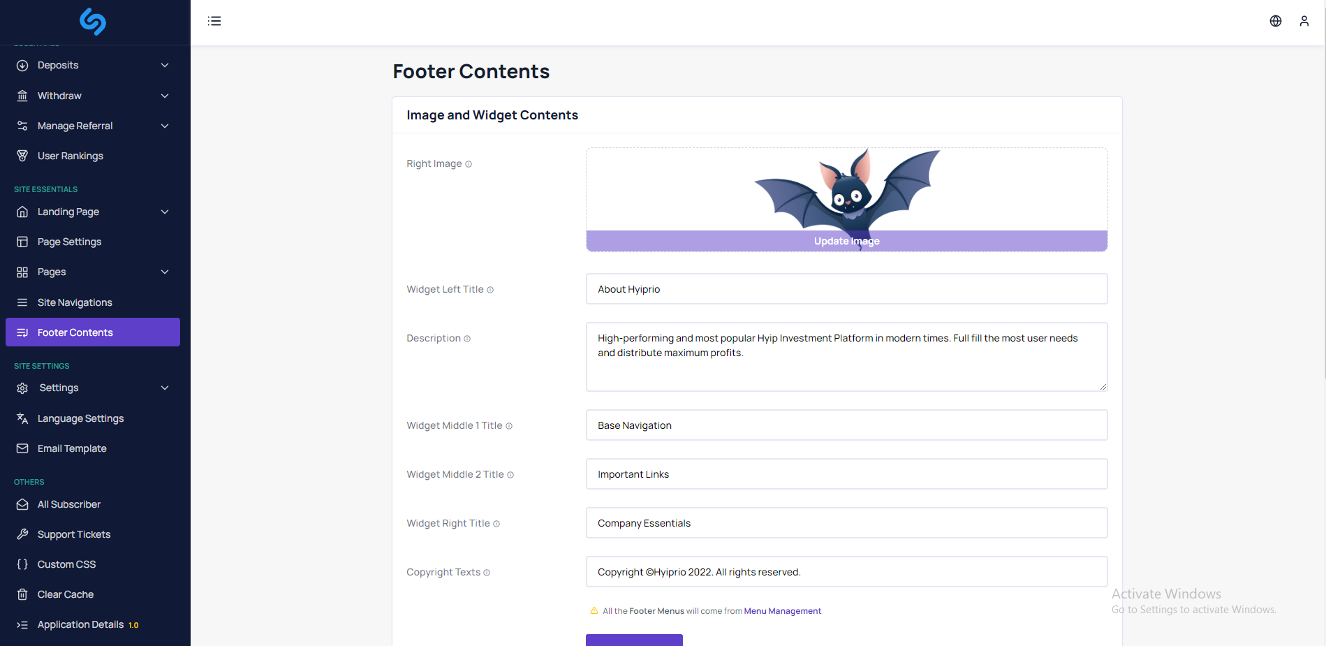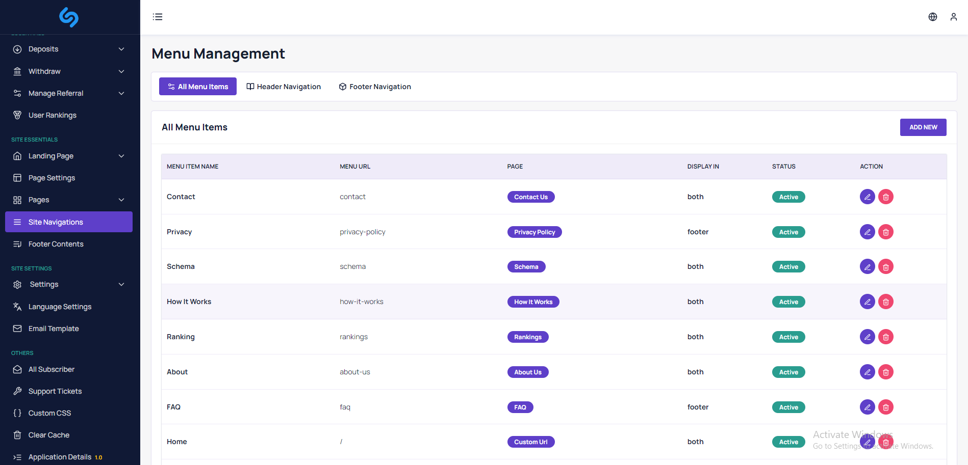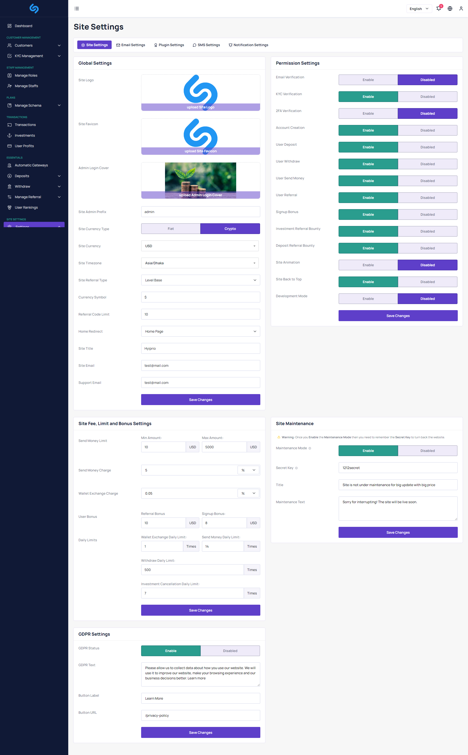 In the Site Settings menu Global, Permission, Site Fee, Limit and Bonus, Site Maintenance, and GDPR