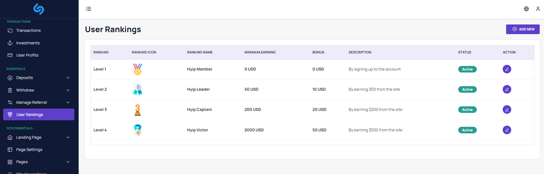 Admin Can set the Rankings Levels with the Badge system. Once the user reaches the amount to earn using