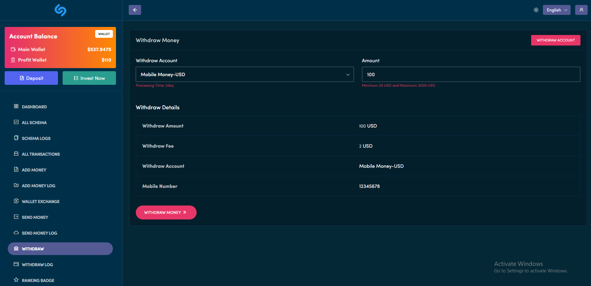 In the dashboard sidebar there are two wallets one is the Main and amount one is the profit wallet. There